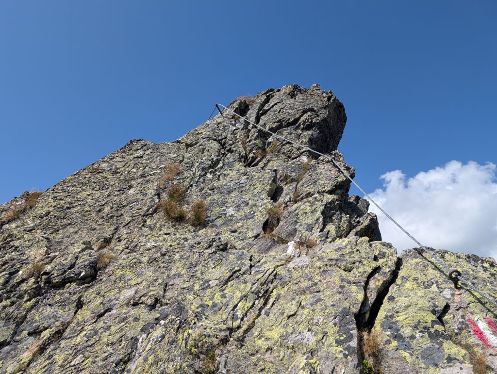 Dort angekommen, trinke ich einen Kaffee und erkundige mich nach dem Wetter. Leider ist für 16 Uhr ein Gewitter gemeldet und da ich nochmals nach oben muss, sollte ich mich beeilen, um wieder rechtzeitig nach unten zu kommen. Laut Reiseführer gibt es eine Abkürzung, welche anstelle über den langen Anstieg zum großen Sadnig, etwas kürzer über den kleinen Sadnig verläuft. Die alternative Strecke sei zwar deutlich anspruchsvoller, sollte mir aber eine halbe Stunde an Zeit einsparen. Also mache ich mich schnell an den steilen Anstieg, der mich tatsächlich regelrecht nach oben katapultiert. Zwischendrin gibt es zwar einen etwas gefährlicheren Abschnitt, bei dem definitiv absolute Trittsicherheit gefordert ist, aber nichts was ich nicht schon gemacht hätte.