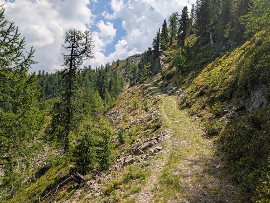 Nachdem ich die dahinter liegenden Almen passiert habe, treffe ich deutlich weniger Leute an, die den Aufstieg zum Schutzhaus Neubau angehen. Bald verlasse ich den Wald und es geht weiter auf kleinen Pfaden den Berg hinauf. Auf über 2000 Metern Höhe ist das Wandern selbst in der Mittagshitze erträglich.
