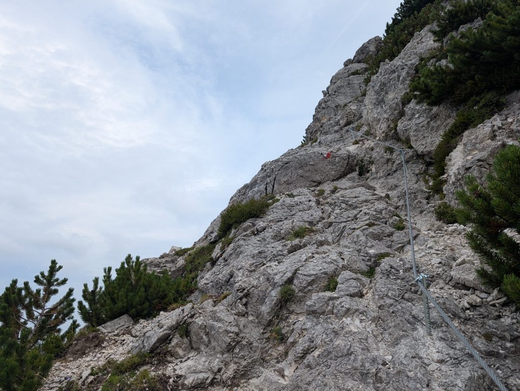Zwischendrin komme ich immer wieder an seilgesicherten Passagen vorbei, bei denen ich mich am Drahtseil festhalte und das ein und andere Mal ziehe ich mich einfach direkt am Seil nach oben.