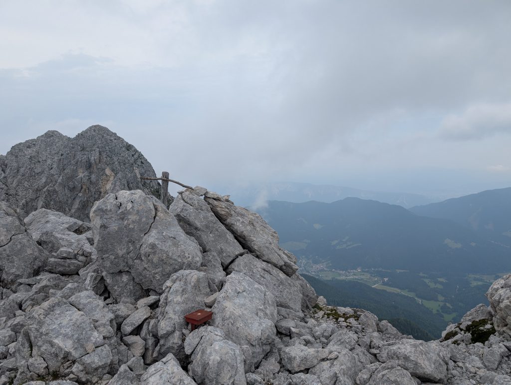 Insgesamt ist der Klettersteig für mich aber auch heute einfach und schon bald komme ich oben am Gipfel an. Da es mir im starken Wind zu kalt für eine Pause ist, steige ich schnell auf der anderen Seite wieder ab.