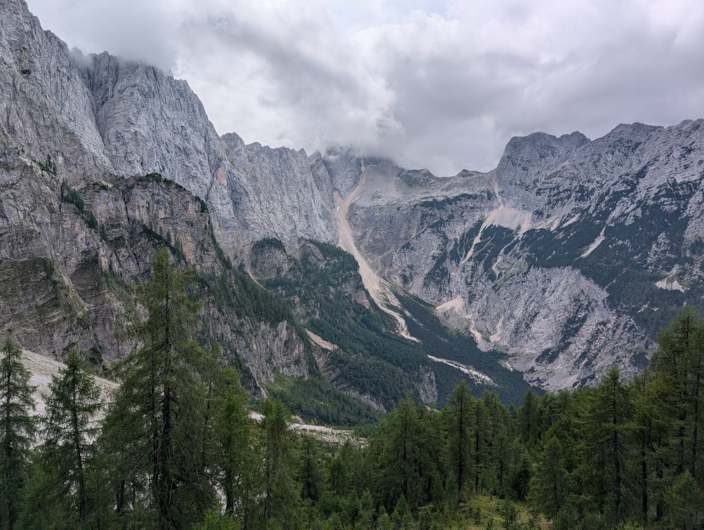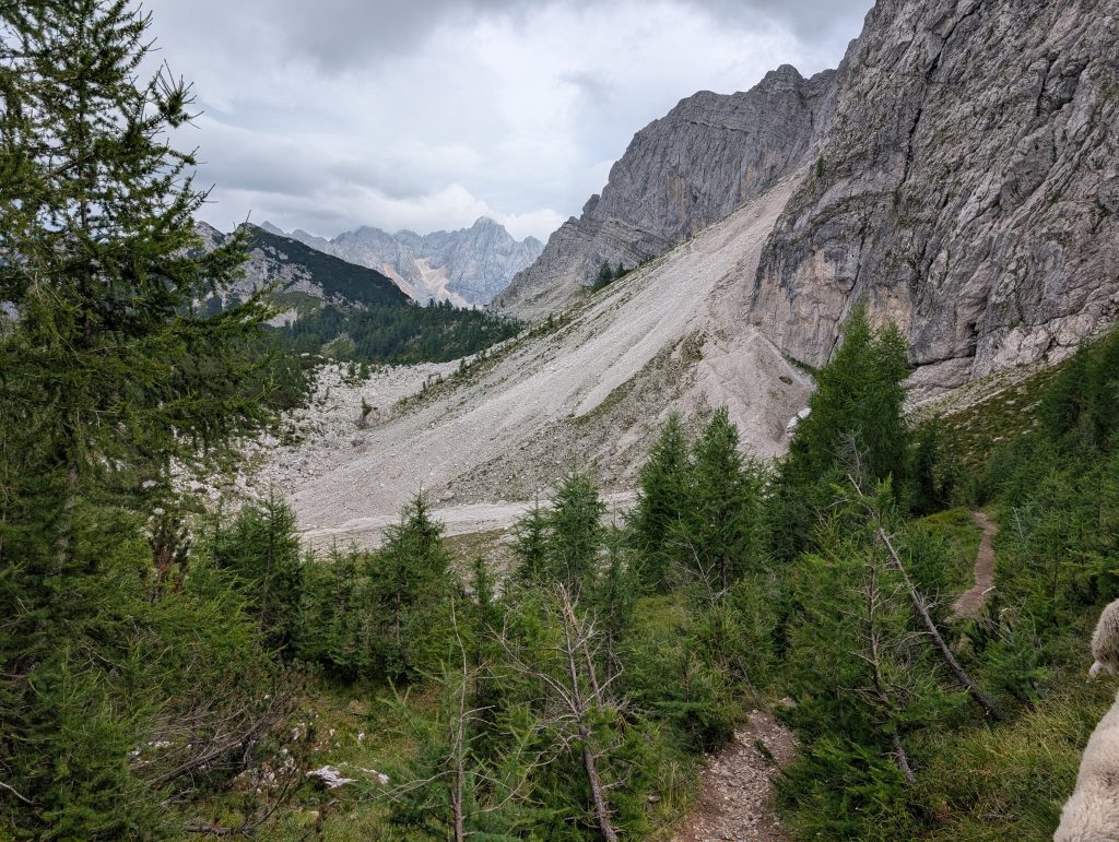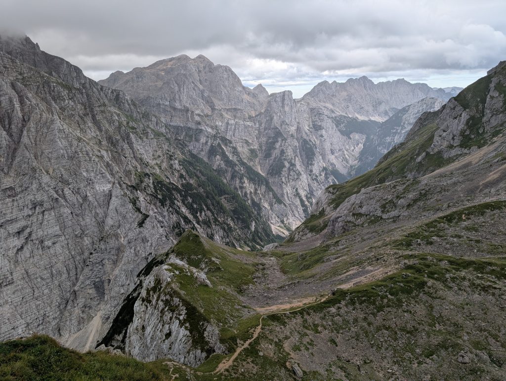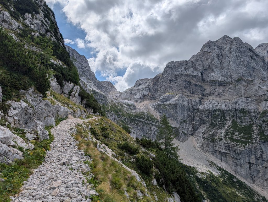 Nach einiger Zeit komme ich an der Koca na Dolicu an. Diese Berghütte wird gerne von Leuten genutzt, die auf den Triglav wollen. Da ich keine Ausrüstung dabei habe und mir die Hüttenwirtin heute morgen bereits von einem Aufstieg ohne Helm aufgrund einiger Vorkommnisse in letzter Zeit stark abgeraten hat, esse ich in der Hütte eine Suppe und mache mich wehmütig wieder auf den Weg. Obwohl ich so nah am Triglav vorbeilaufe, lasse ich dieses Abenteuer vorerst aus und verschiebe es auf die Zukunft. Immerhin habe ich dann einen guten Grund mal wieder hierher zurück zu kommen.
