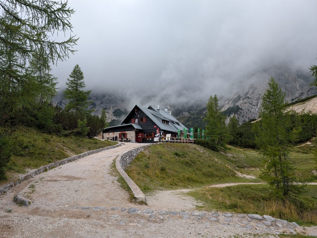 Danach steige ich auf der anderen Seite wieder lange ab. Der Weg hat zwar keinen Klettersteig, aber ich rutsche auf dem Geröll häufig ziemlich durch die Gegend. Später geht es noch kurz durch den Wald und gerade als der Regen einsetzt, erreiche ich die Hütte Dom v Tamarju, welche ich bereits von weiter oben gut sehen konnte.