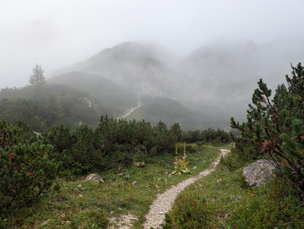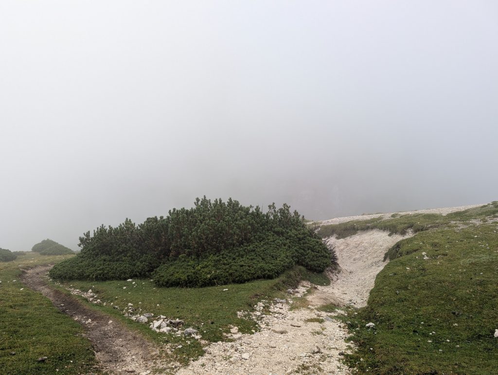 Leider regnet es von Beginn an ziemlich heftig und ich bin bald komplett durchnässt. In der ersten Stunde bekomme ich so gut wie keine Berge zu Gesicht. Die meiste Zeit laufe ich in einer Wolke, wo ich weder viel sehen noch hören kann.