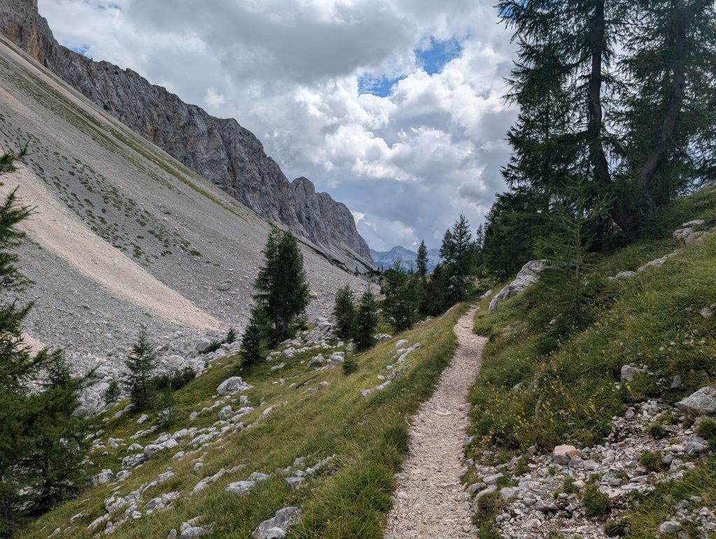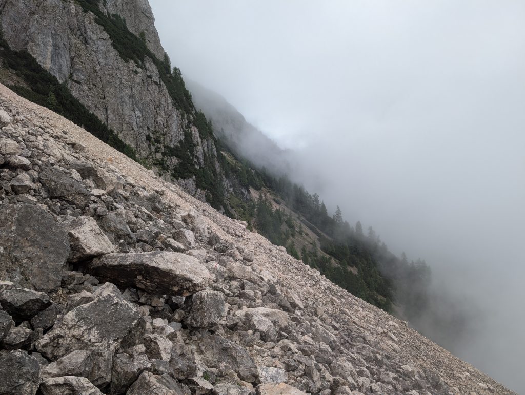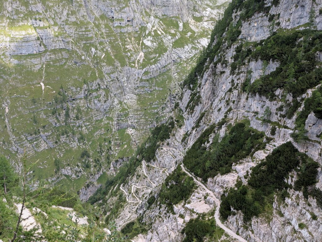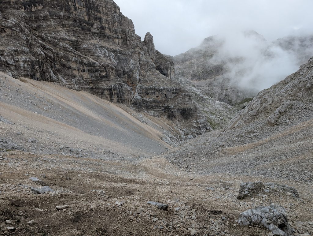 Oben geht es dann kurz am Hang entlang, bevor auf der anderen Seite noch ein kurzer, aber steiler Abstieg über Schotter erfolgt. Da ich keinen Helm dabei habe bin ich hier ganz froh, dass außer mir niemand unterwegs ist. Es geht lange Zeit in Serpentinen den Hang hinunter und insgesamt ist der Weg sehr Steinschlag gefährdet.