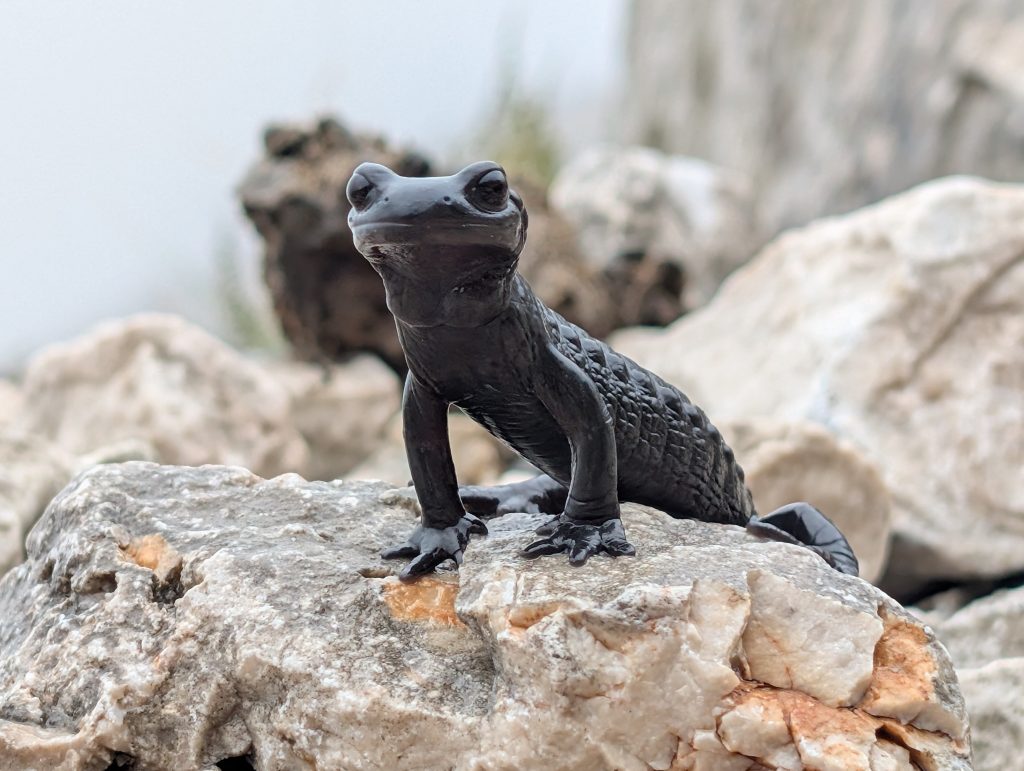 Immerhin begegne ich unterwegs ab und an kleinen schwarzen Alpen-Salamandern, die in der sonst so weißen Umgebung sehr interessant aussehen. Die seltenen Tiere wirken als ob sie mich anlächeln würden und aufgrund der Kälte bewegen sie sich auch kaum.