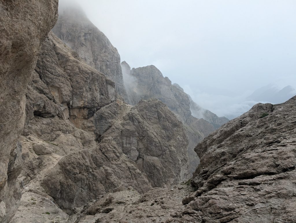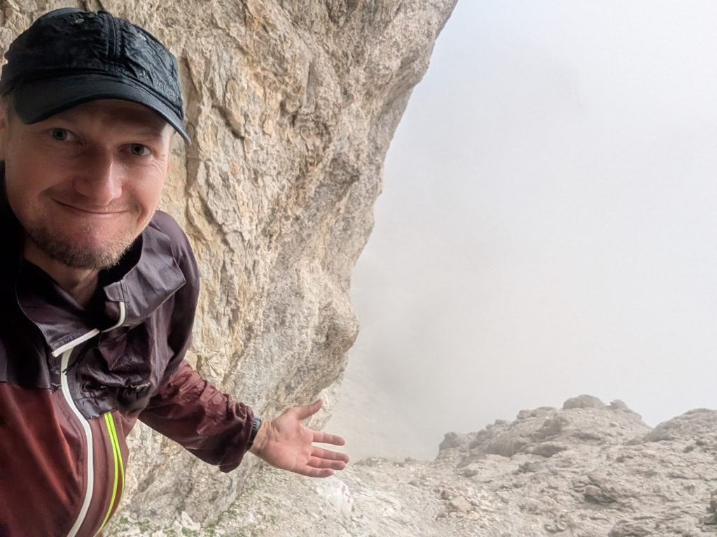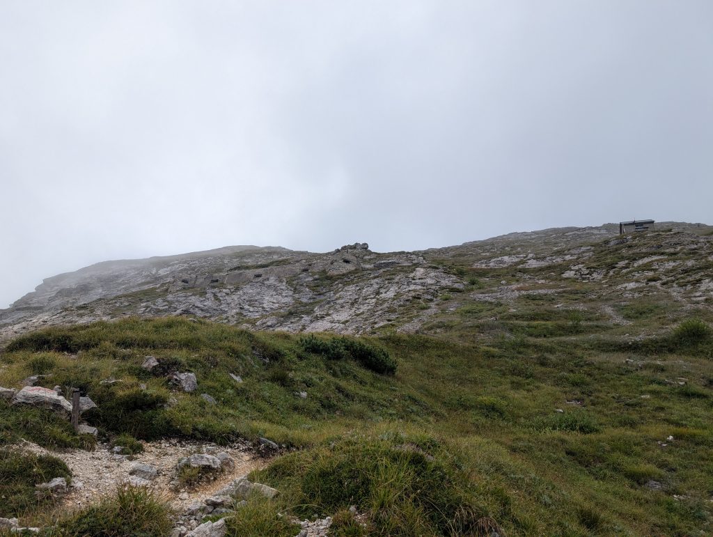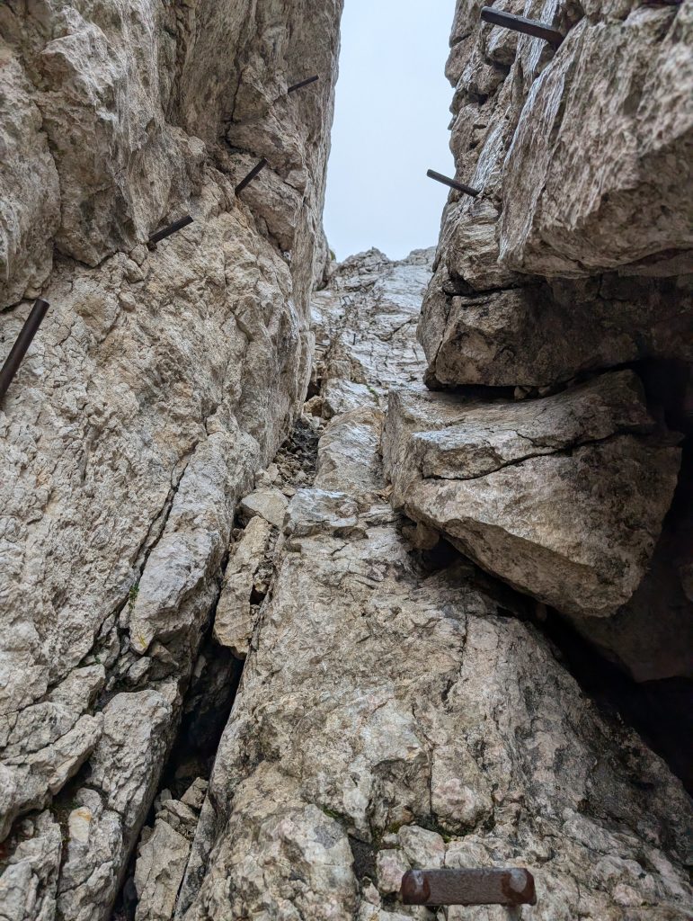 Dann mache ich mich wieder auf den Weg und kann bei besserem Wetter den letzten Teil des Anstiegs absolvieren. Es folgt der Klettersteig, welcher aber tatsächlich nicht wirklich anspruchsvoll für mich ist und selbst das nasse Kalkgestein ist weniger rutschig als erwartet. Somit steige ich schnell die letzten Meter auf.