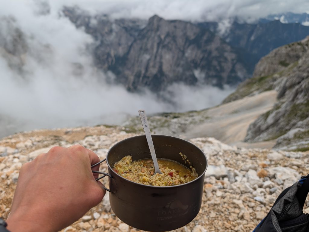 Bald komme ich dann unten an und es trennen mich nur noch wenige Minuten von der Hütte, in der ich heute übernachten möchte. Da es noch früh ist und ich eventuell erst am Abend etwas zu essen bekomme, setzte ich mich auf einen Stein und koche mir Couscous.