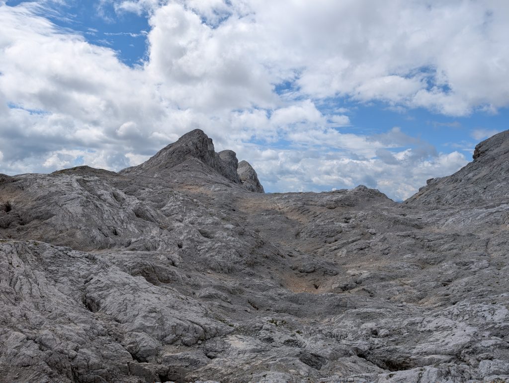 Für mich geht es weiter durch eine markante Steinlandschaft. In der leblosen Gegend sind immer wieder schöne Trichter zu erkennen, die typisch für das Kalkgestein sind. Das Regenwasser fließt nicht über Rillen ab, sondern durchbohrt den Boden regelrecht und versickert dann weiter unten, wodurch auch einige interessante Höhlen hier sein sollten.