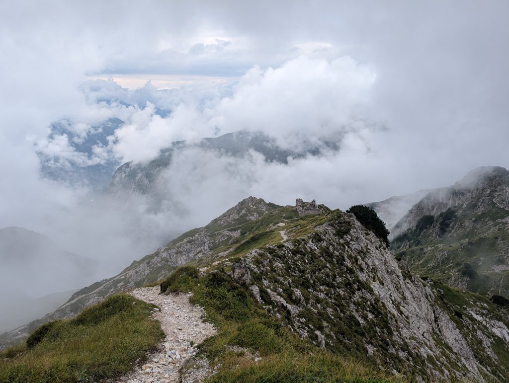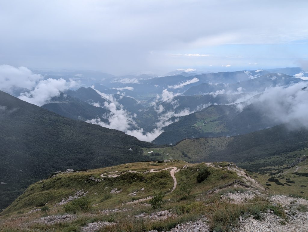 Nach einiger Zeit erreiche ich dann endlich den höchsten Punkt, habe aber absolut keine Sicht und es fängt schon wieder an zu regnen. Zum Glück komme ich an einem kleinen Schutzhaus vorbei, wo ich Unterschlupf suche. Dort sind bereits zwei Wanderer und sitzen mit mir zusammen den Regenschauer aus. Wie sich herausstellt kommen sie aus Triest und wandern hier für ein paar Tage. Sie geben mir etwas von ihrer Schokolade ab und wir unterhalten uns bis der Regen nachlässt.