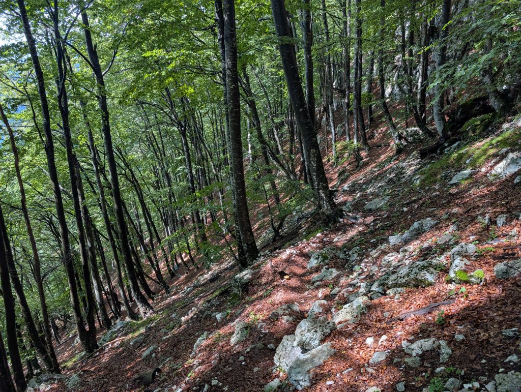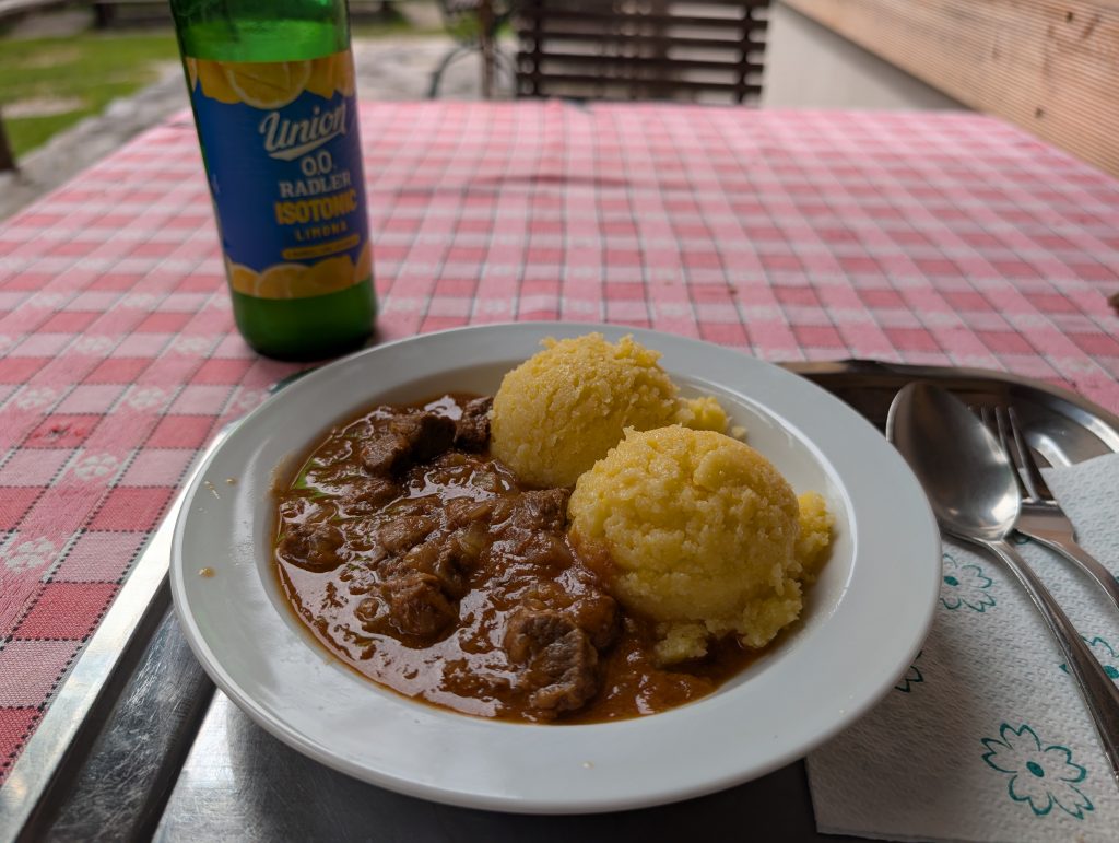 Es geht längere Zeit den Berg hinunter und immer wieder sehe ich alte Bunkeranlagen des ersten Weltkrieges. Kurz nach Mittag komme ich an der Planini Razor an und esse dort Gulasch mit Knödel.