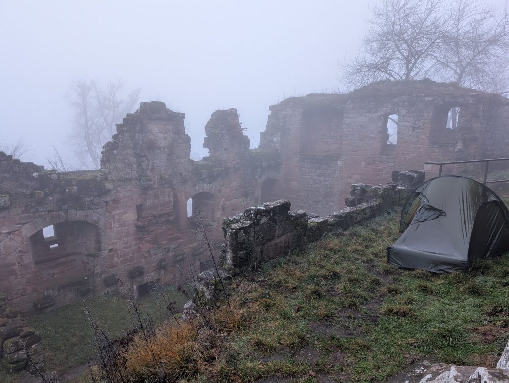 Als ich am Morgen aufwache ist zwar mein ganzes Zelt nass und die Burg befindet sich wieder in dichtem Nebel, aber immerhin habe ich sehr gut geschlafen.