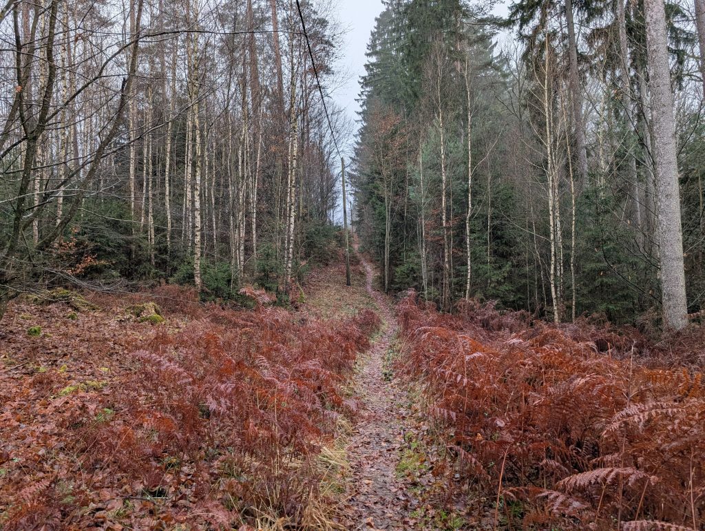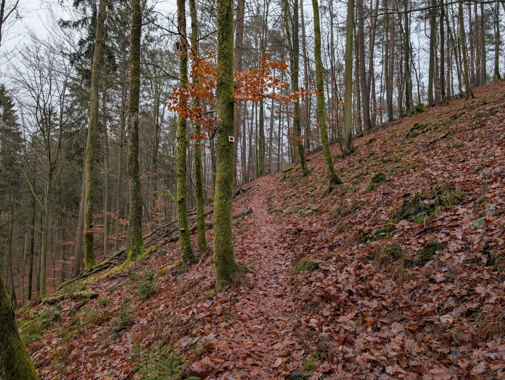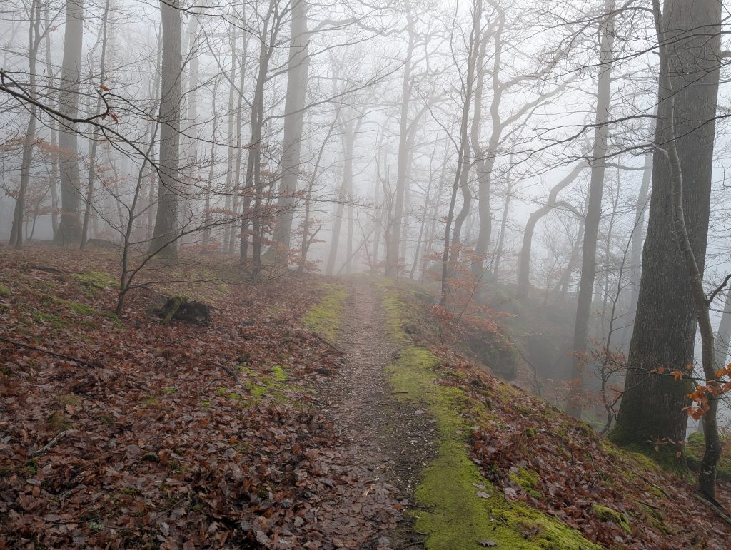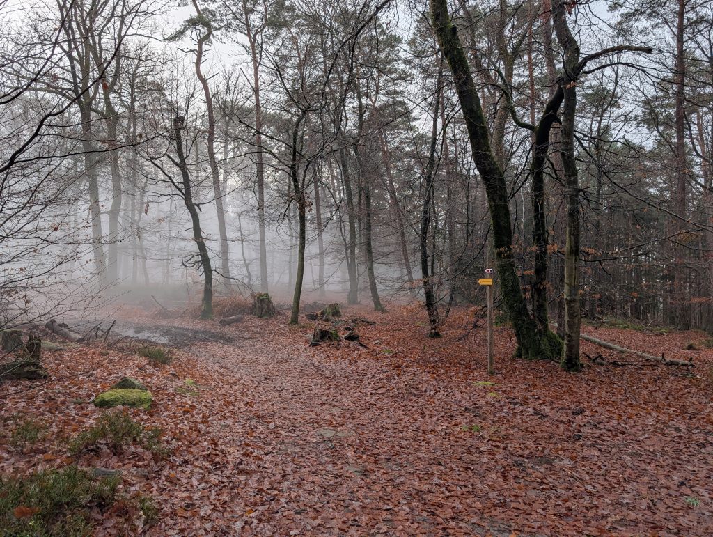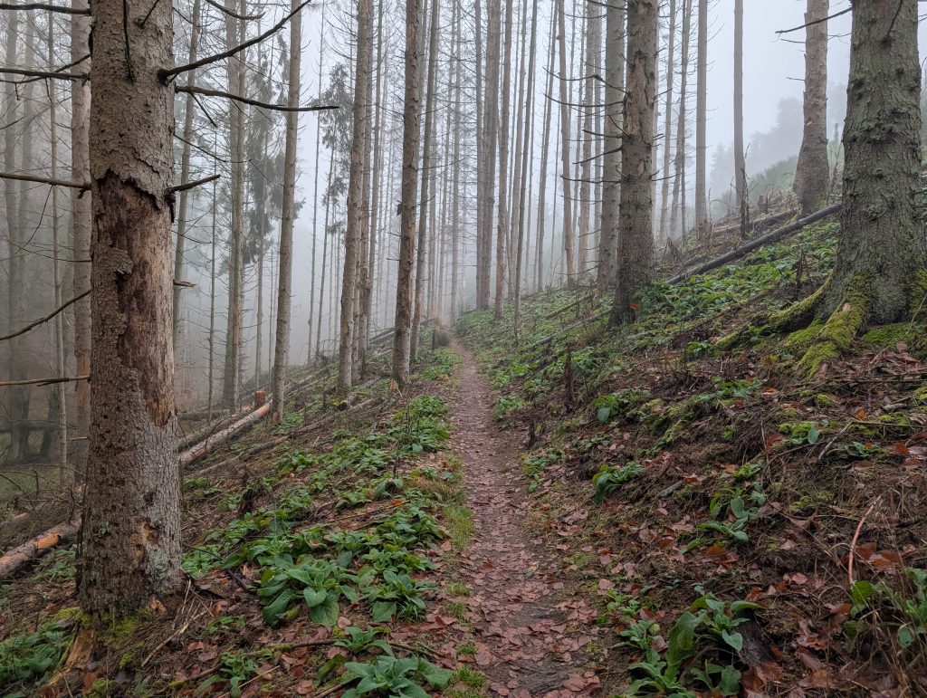 Leider bin ich bald schon wieder in dichtem Nebel unterwegs und somit war meine Schönwetterwanderung nur von kurzer Dauer. Erneut geht es längere Zeit durch den Wald hinab.