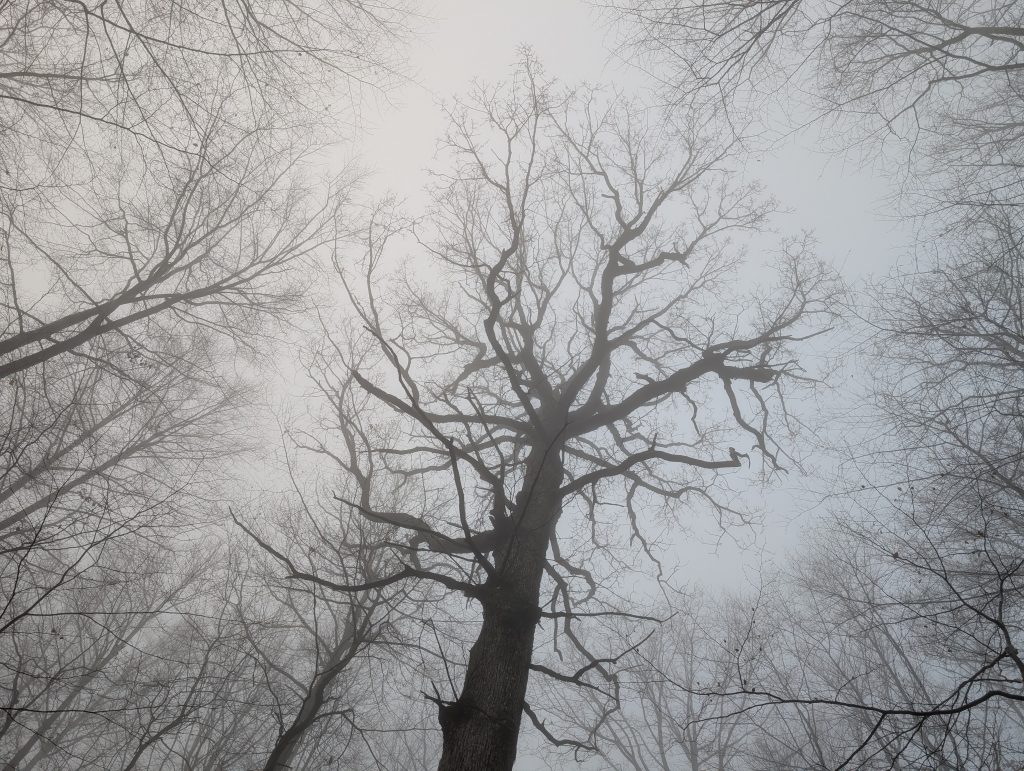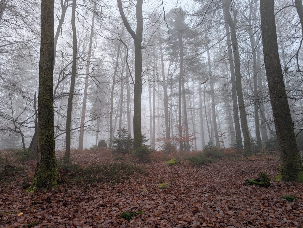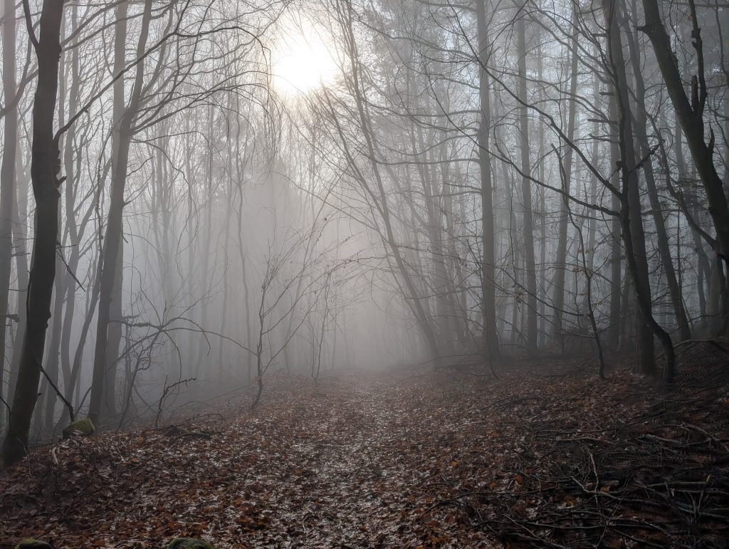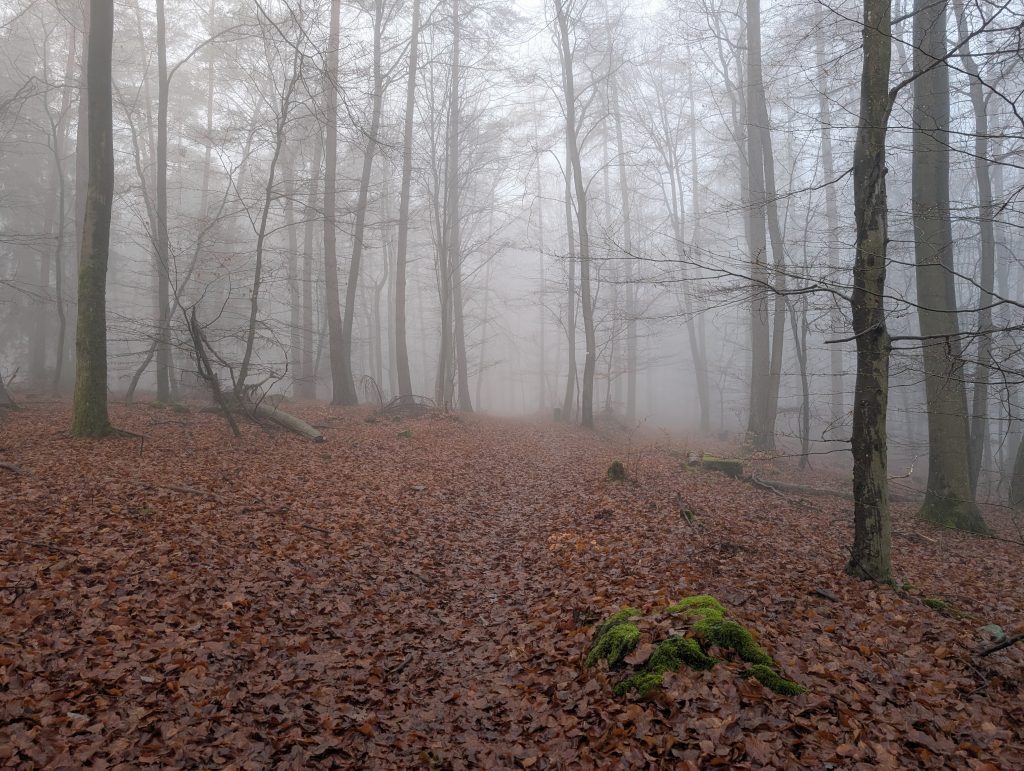 Nach einigen Minuten schnellem Wandern, wird mir direkt warm. Es geht für mich am Morgen erneut durch Wälder, die durch den Nebel interessant aussehen.