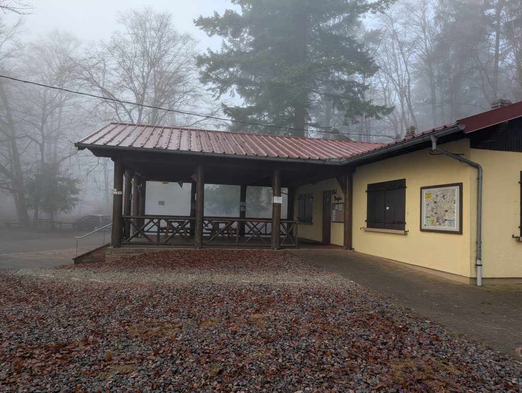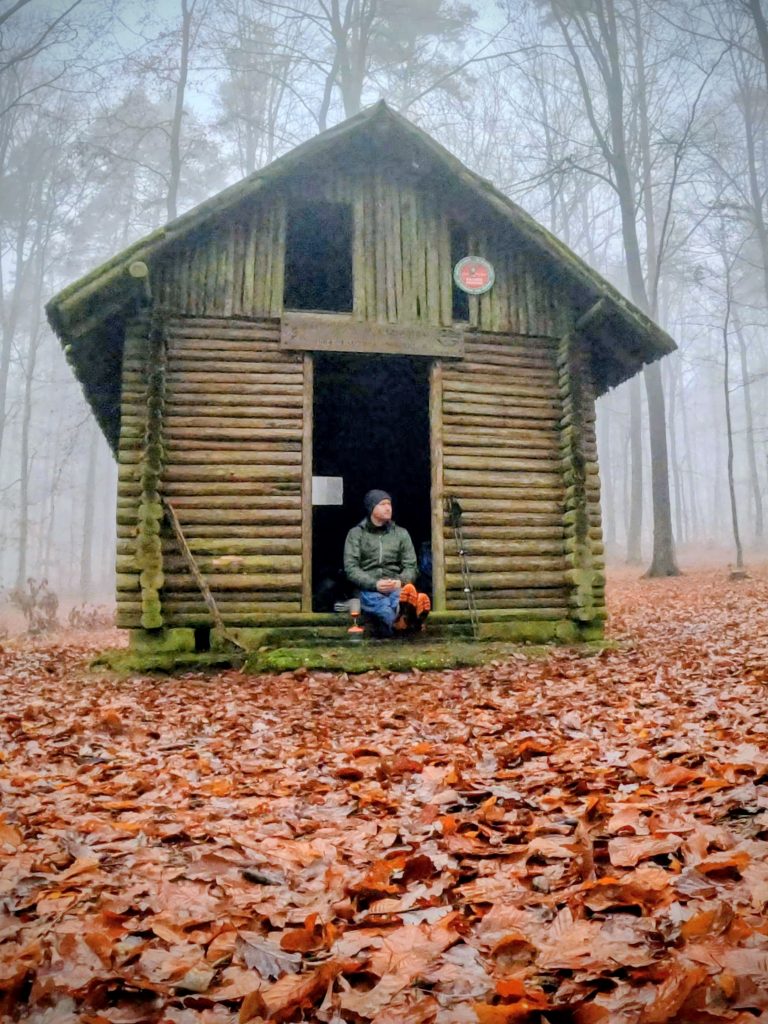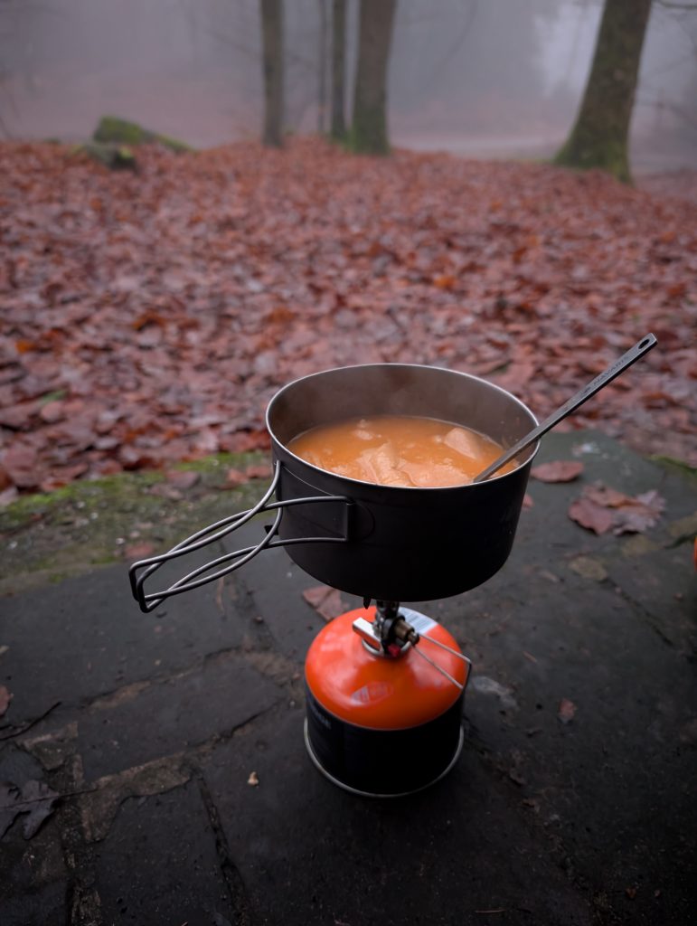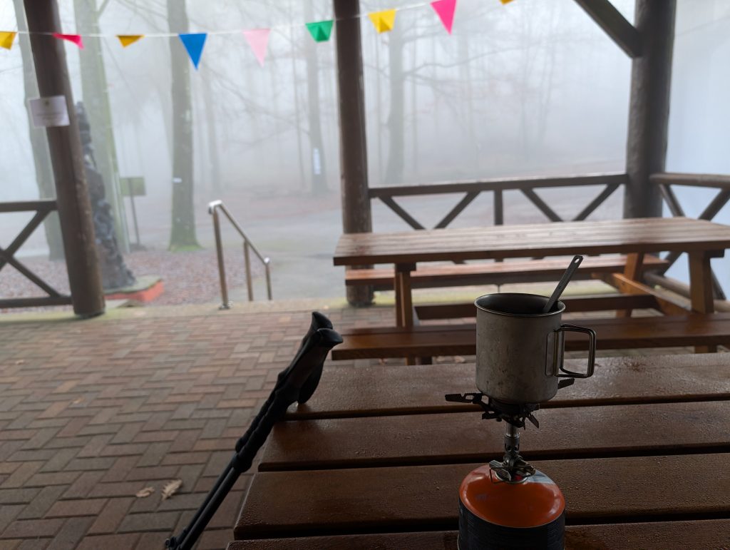 An einem Wanderheim, welches leider geschlossen hat, finde ich einen trockenen Platz, wo ich endlich frühstücken kann. Ich koche mir eine Tasse Kaffee, welche bei den Temperaturen besonders wohltuend ist. Dazu gibt es Baguette mit Salami.