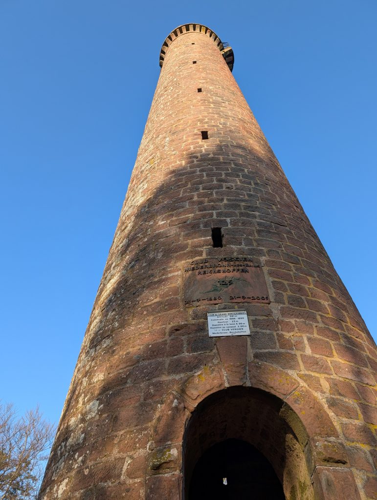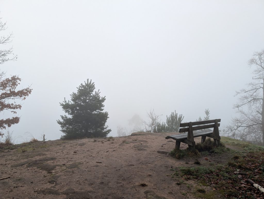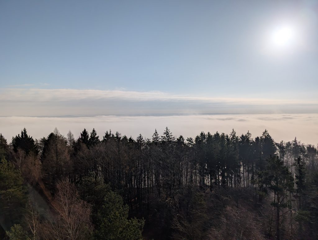 Schnellen Schrittes nehme ich die vielen Stufen auf mich und kann von oben auf die Wolkendecke blicken. Weiter hinten ist der Rheingraben zu erblicken, aber insgesamt kann ich nicht viel sehen. Da hier oben aber die Sonne scheint, bleibe ich einige Minuten stehen und genieße den Blick auf die Wolken. Dann steige ich wieder hinab und mache mich erneut auf den Weg hinunter ins Tal.