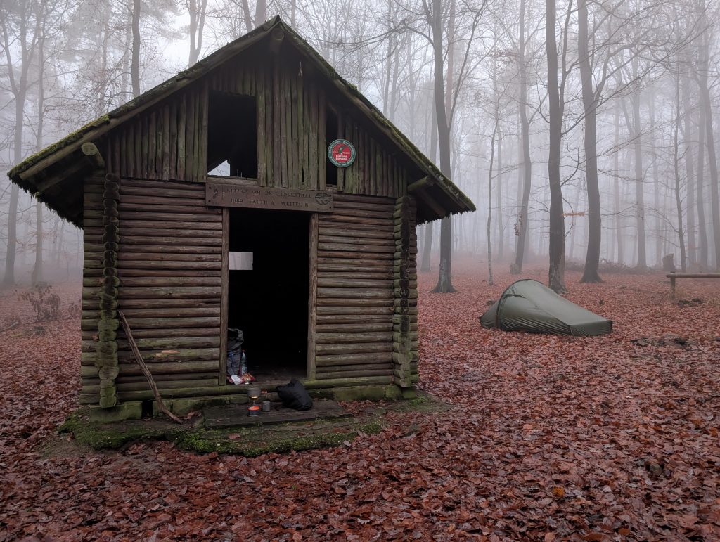 Nach zwei weiteren Stunden erreiche ich eine Schutzhütte im Wald, wo ich heute übernachten möchte. Das Nachtlager im Speicher ist leider auf beiden Seiten offen, wodurch ich bedenken habe, dass mein Schlafsack in der Nacht bei dem viele Nebel nass wird. Unten passt es mir auch nicht so Recht und somit baue ich direkt daneben mein noch feuchtes Zelt auf. Wirklich trocken wird es leider auch nicht mehr.