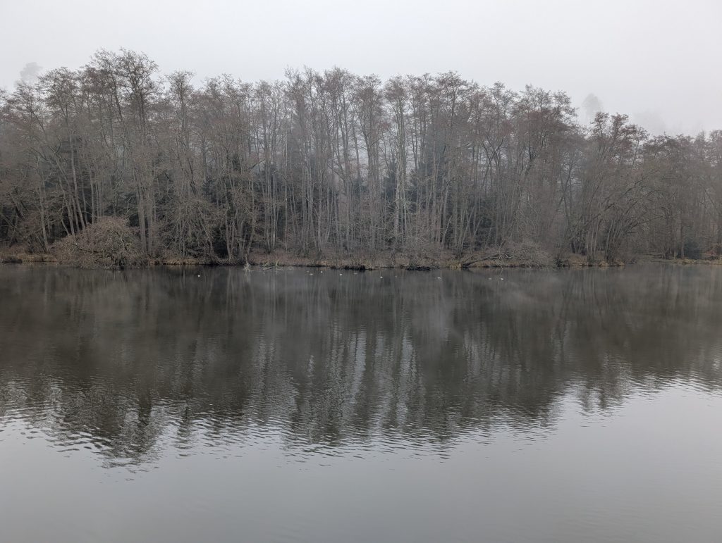 Die Natur wirkt auch heute wieder sehr ruhig und viel zu sehen gibt es auf den ersten Metern leider nicht. Bei einer Bank, bei der man normalerweiße sicher eine gute Aussicht hat, laufe ich einfach vorbei, da es mir zu kalt zum Sitzen ist und die Aussicht auch nicht gerade zum Verweilen einlädt.