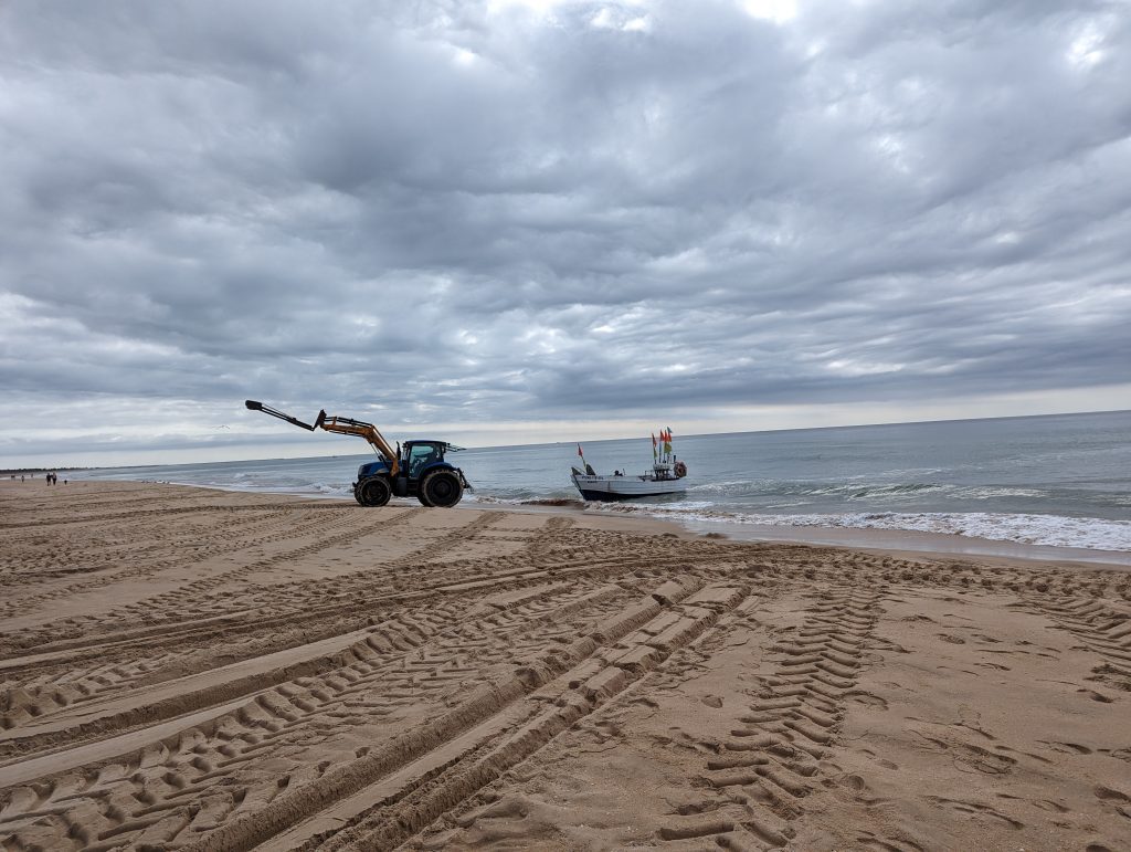 At one point I was able to watch the fishing boats being pulled across the beach to their places by a tractor. They left deep tracks in the sand and walking along this section wasn’t particularly easy.