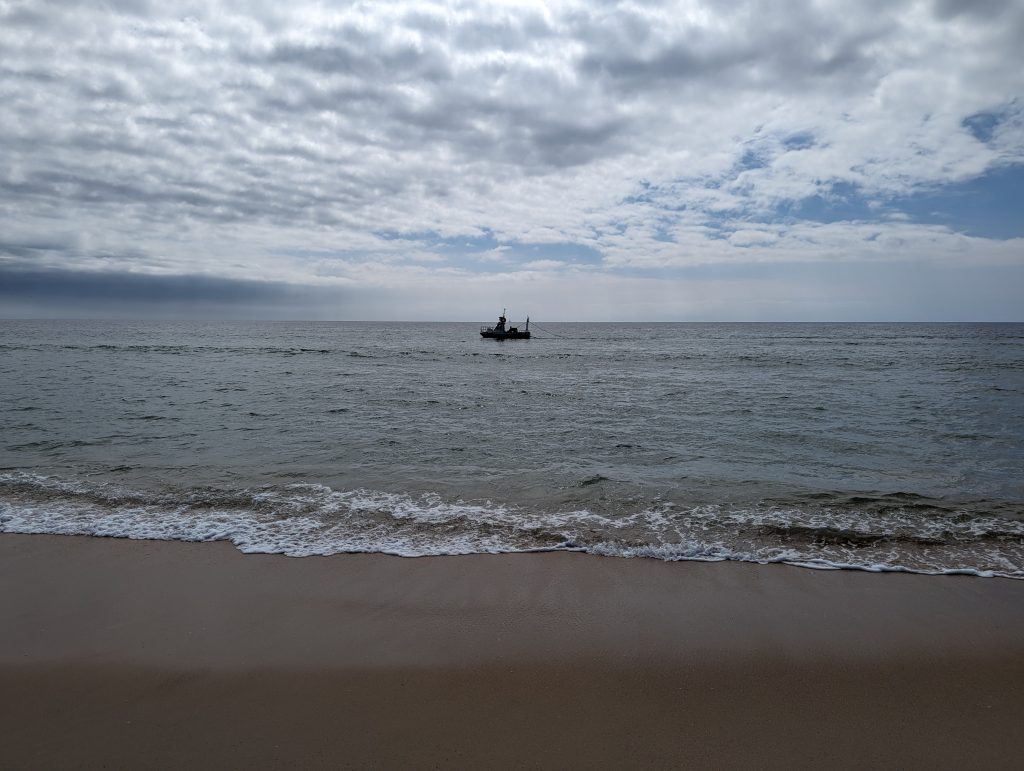 The path now took me almost 10 km along the water and further and further west. Since there wasn’t much going on and I was pretty much alone on the sand alongside a few joggers and walkers, running in the beautiful surroundings was really fun. Most of the time I ran right next to the water in the wet sand to prevent myself from sinking and to still make progress reasonably quickly. The whole time I heard the sound of the waves next to me, which had a very calming effect, and I watched some fishing boats at work on the water.