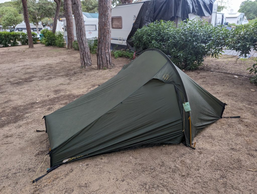 Shortly before I reached the bridge over the last river before the city, I climbed down from the path, followed a small path up a hill and sat there on a large stone. Here I found a suitable spot for my tent. The view wasn’t the highlight, but since it was almost dark, that didn’t bother me much. I cooked myself dinner and until I had eaten it, I was able to set up my tent in the pitch black, which I managed to do well thanks to my intensive training over the last few months. After that I went to sleep soon because I didn’t have much else to do.