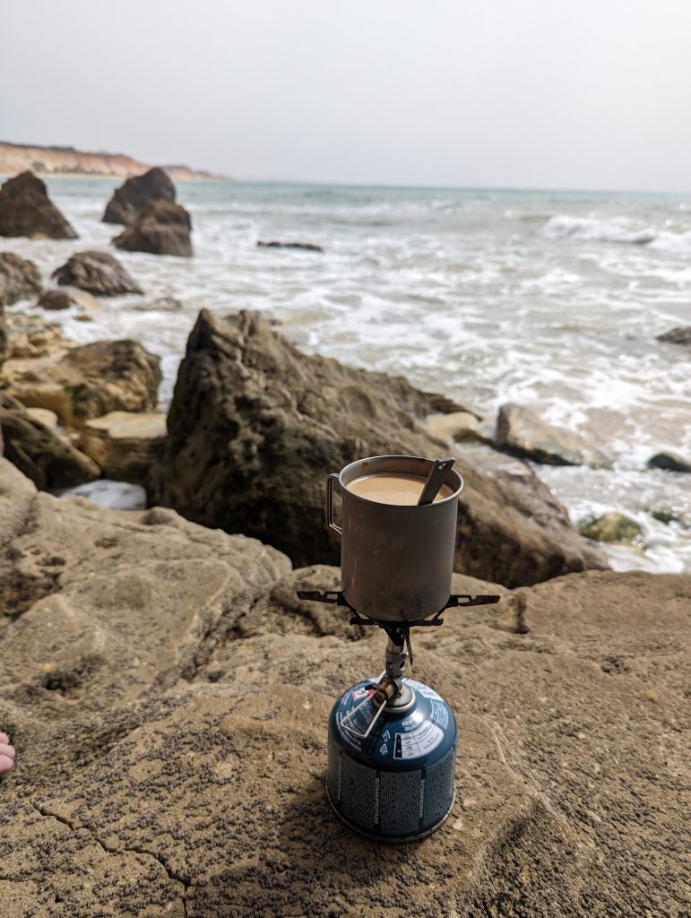 On one of these beaches I climbed along a few rocks and came to a small ledge that was not visible from the beach but was still protected from the high waves. Here I finally unpacked my gas stove again and made myself a delicious coffee. While the water crashed onto the rocks right in front of me, I happily drank my coffee and enjoyed the natural spectacle.