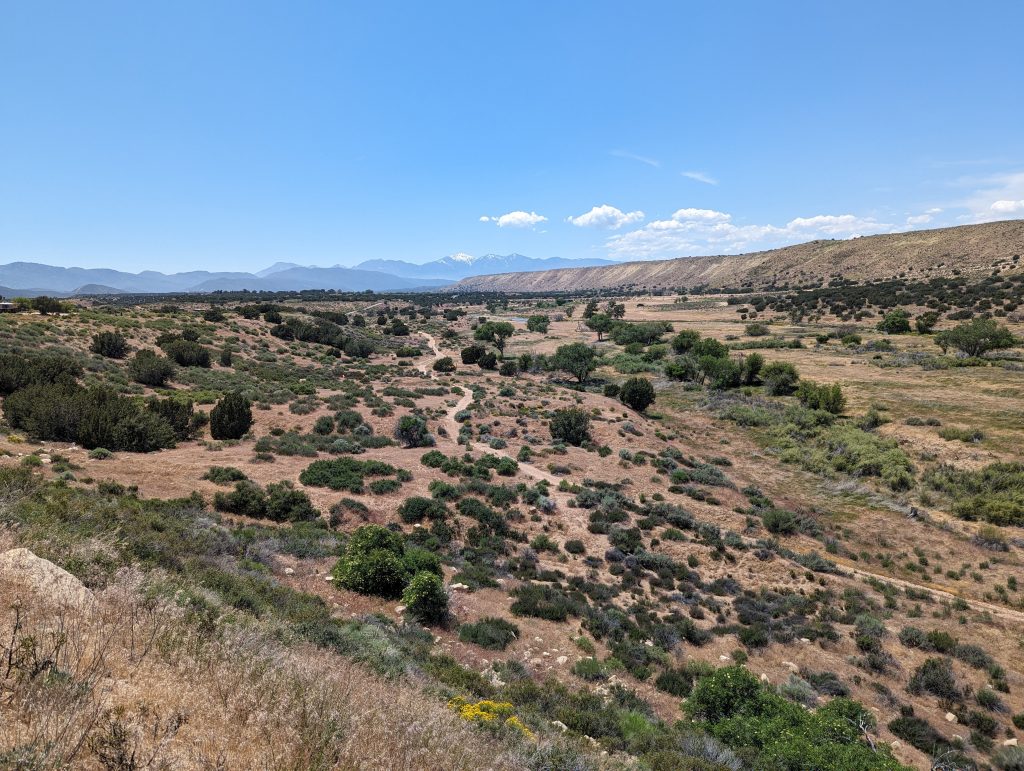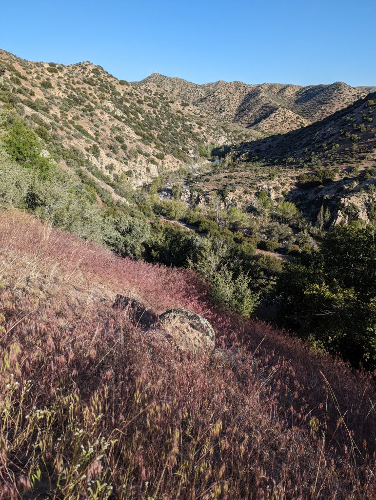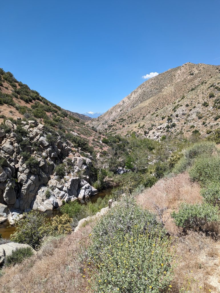 Here there is a small river to cross and then it goes first briefly through grass and then again along the slope through bushes for a long time. In the distance I can see some snow-covered mountains and I really like the landscape. Due to my long break in the water, I’m a bit late today. Since I still want to make my 20 miles, I hardly take longer breaks afterwards.