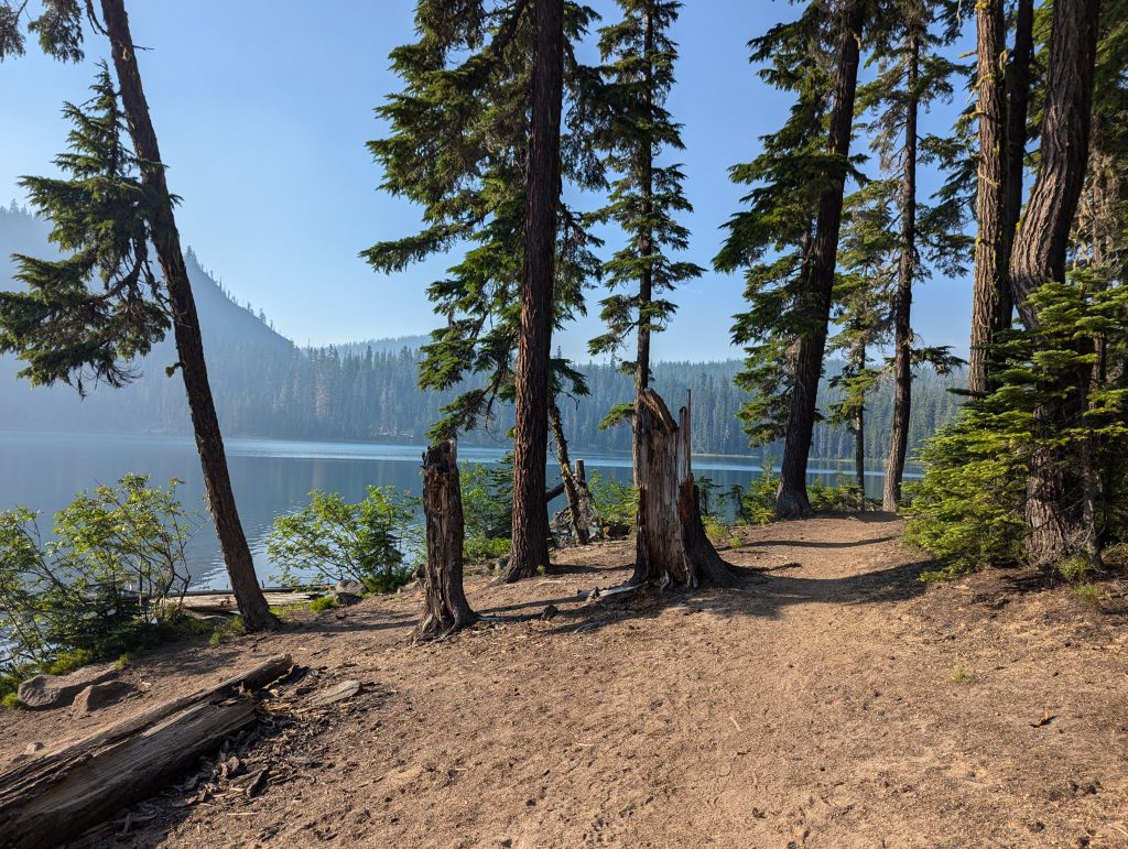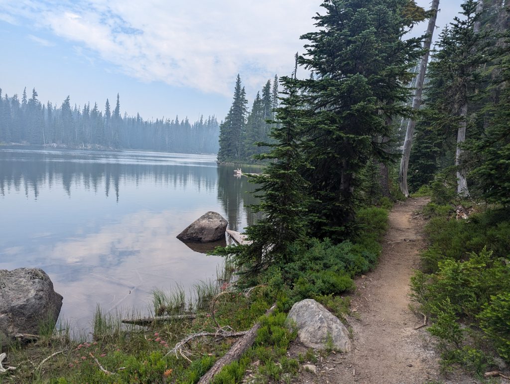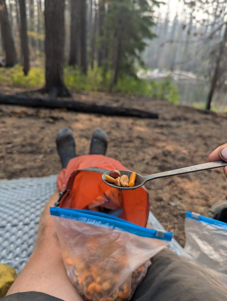 Later, Gonzo and I take a refreshing dip in the lake before eating a delicious burger for lunch. When I asked around 2 p.m. whether my package was there, I was told that unfortunately they couldn’t get it because the staff had too much to do. But I don’t want to wait for tomorrow either, so I’ll browse through the hiker’s box again and put together a meal plan for the next few days. A few more snacks are bought in the shop to round off the food.