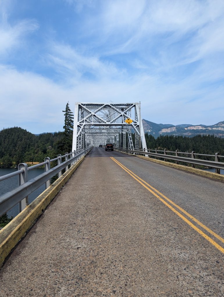 When I finally made it, I finally make my way to the ‘Bridge of the Gods’ to get to Washington. After just a few minutes I reach the bridge and we walk to the other side. There is no sidewalk for pedestrians, so I walk across the border in the left lane. The wind is blowing quite strongly and since the bridge only consists of a grid as a ground, I can see the water flowing underneath me.