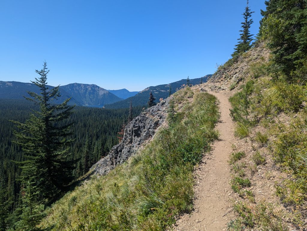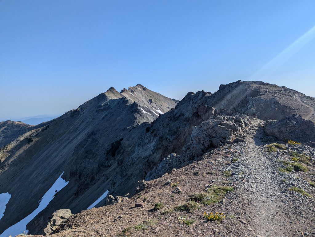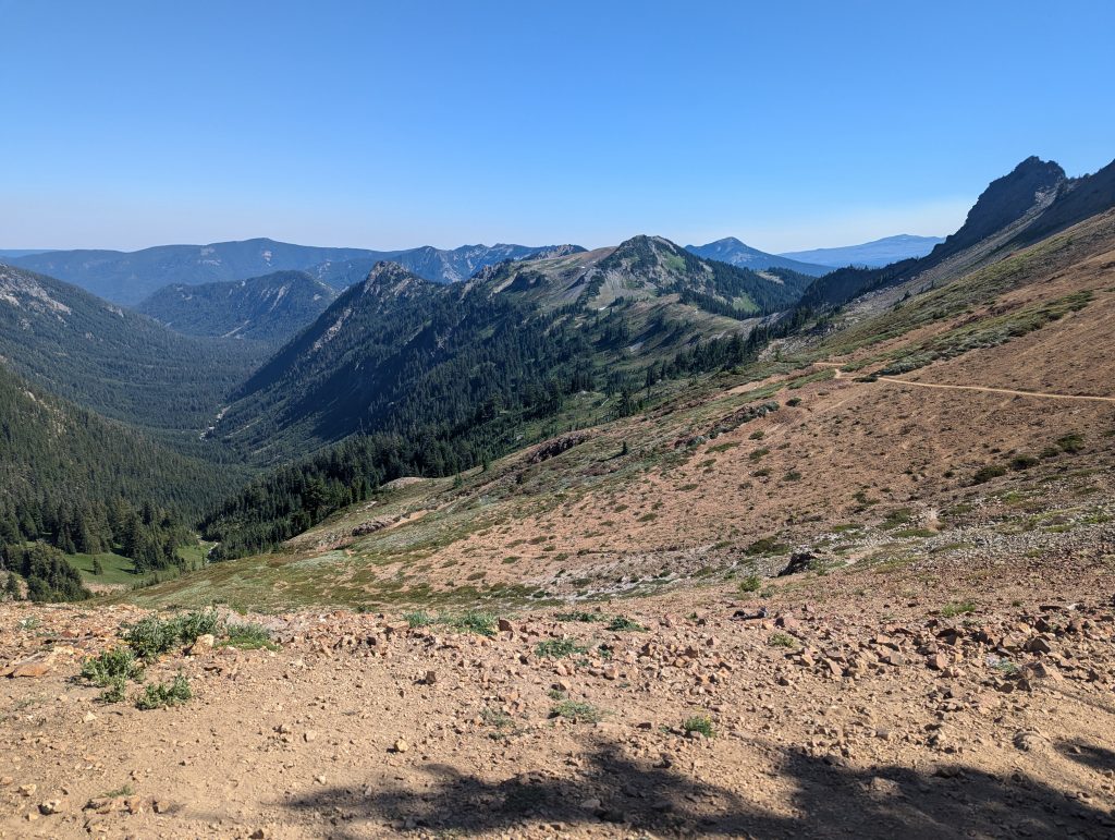 After that I descend over scree for a long time and return to the PCT. From here it goes fantastically and both to the right and to the left of me it often goes steeply downhill. So finally I’m back in the mountains and enjoying the hiking very much.