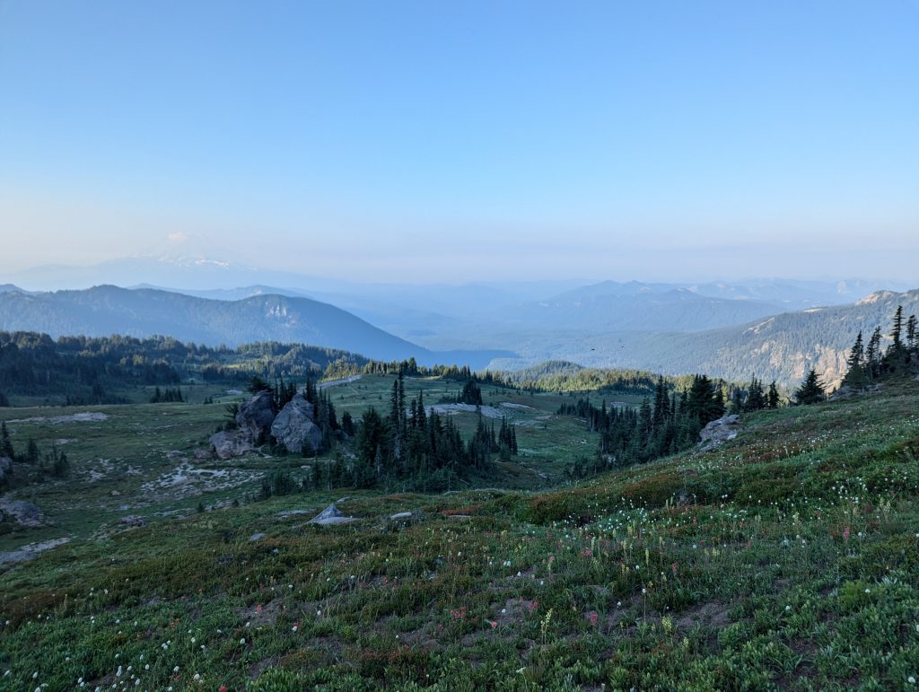 I get up at 6 a.m. and have breakfast. In the morning the path leads me straight up. First briefly through the forest and then over smaller meadows. The view is a bit clouded by the smoke of the fire, but I still really like it.