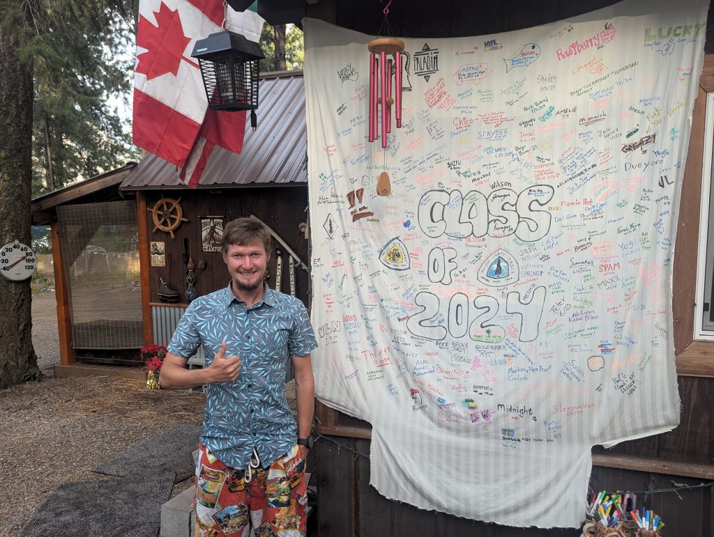 Here is a picture of me at the northern terminus, which means the end of my journey on the PCT. In the forest behind me you can see the border between the USA and Canada, even if it is significantly less spectacular than you might expect.