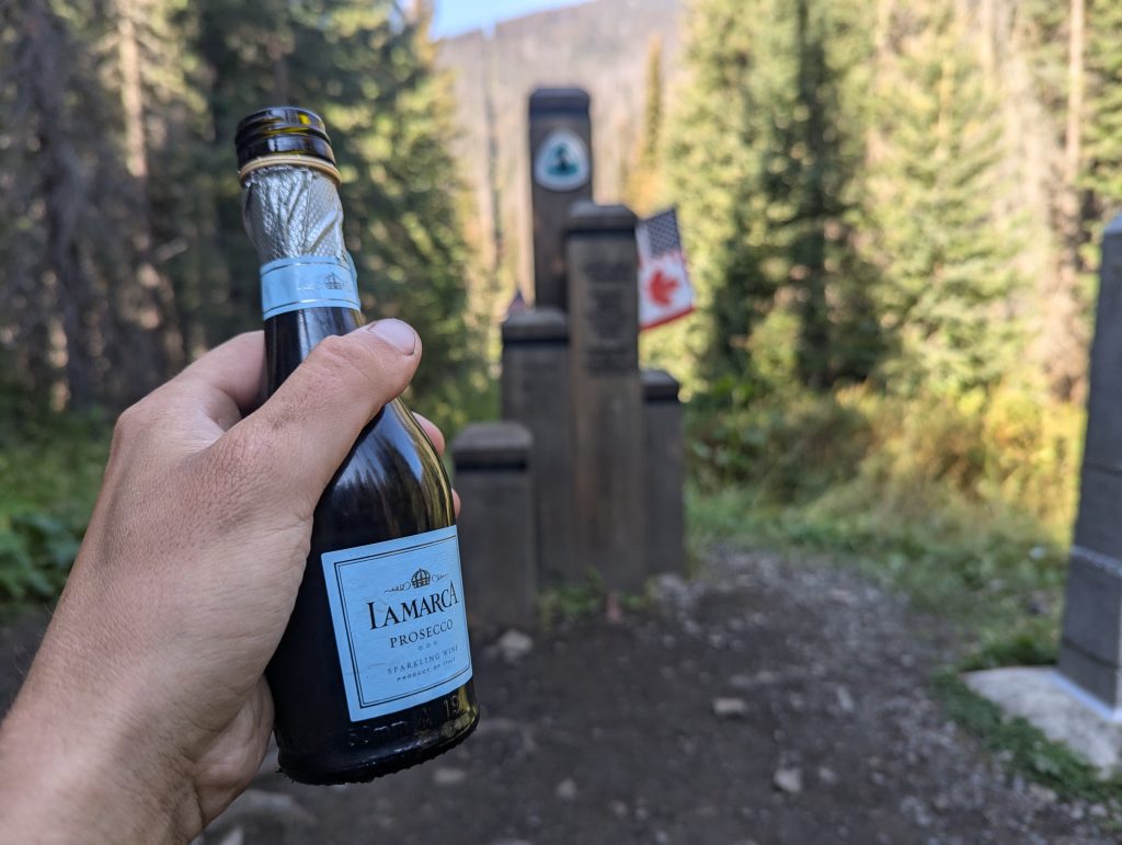 Since nobody else is here, I’ll take a few pictures first and then unpack a bottle of Prosecco, which I took with me especially for this occasion. Although it’s only just before 10 a.m., I’m toasting on my own reaching the border with Canada.